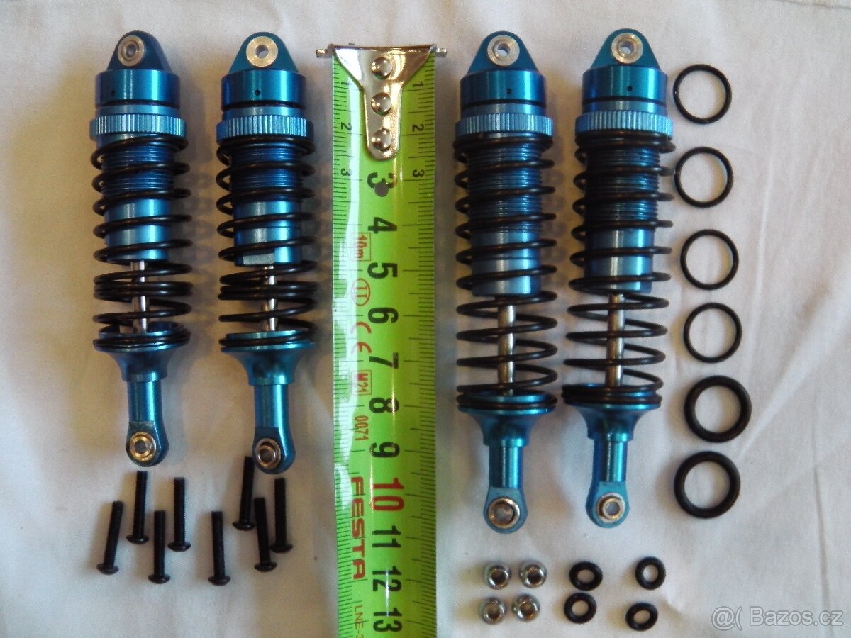Prodám použité, naplněné olejem RC tlumiče viz. fota. Rozteč ok zadních tlumičů 105mm, předních 90mm, průměr tlumičů s pružinami 22,5mm, včetně náhradního těsnění a montážních dílů. Cena 190,-Kč včetně zaslání přes Balíkovnu.
