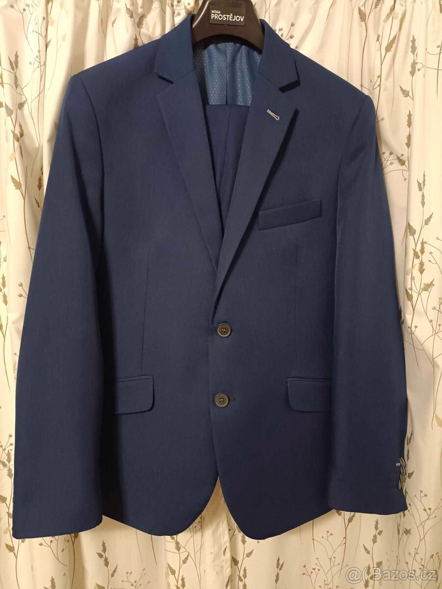 Prodám modrý pánský (chlapecký) oblek velikosti 48, výška 170 vhodný například do tanečních. Oblek je jako nový. K tomu přidávám 2 košile velikosti S zdarma.