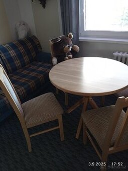 Prodam jidelni stul z masivniho dubu v prirodni barve.Prumer stolu 90cm.Sila desky 3cm + 4 ks zidli.Cena za komplet 9000,-Kc.Mozno i zvlast.Stul 7000,-Kc,zidle 2000,-Kc