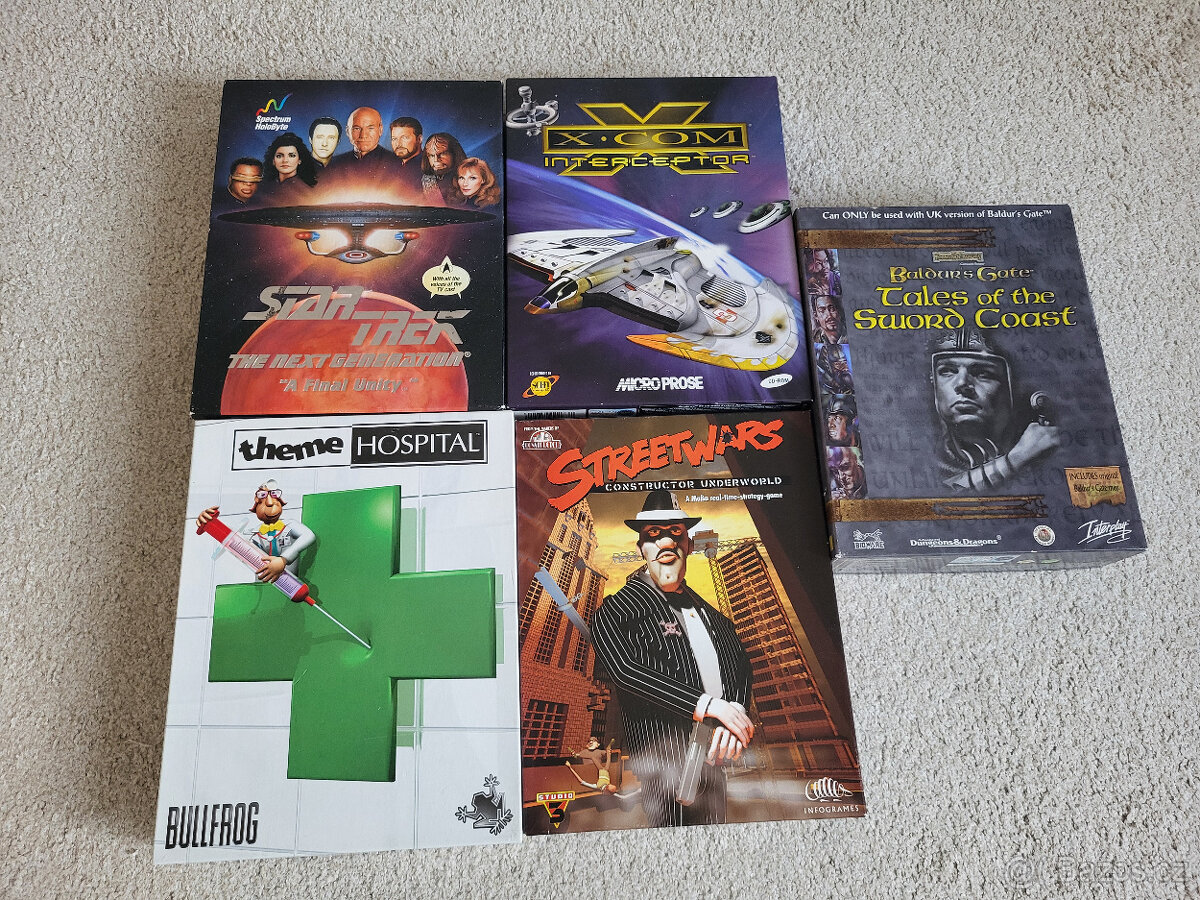 Cena: V textu. Nabízím staré PC hry v kompletních big boxech v hezkém stavu. Star Trek Next Generation - 700,-Kč XCOM Interceptor - 700,-Kč - PRODÁNO Theme Hospital - 2 000,-Kč - PRODÁNO Street Wars - 2 000,-Kč Baldurs Gate Tales of The Sword Coast - 1 200,-Kč - PRODÁNO Osobní předání Praha 6 Břevnov. Zaslání po platbě předem na účet. Zásilkovna 90,-Kč Dopravce PPL 90,-