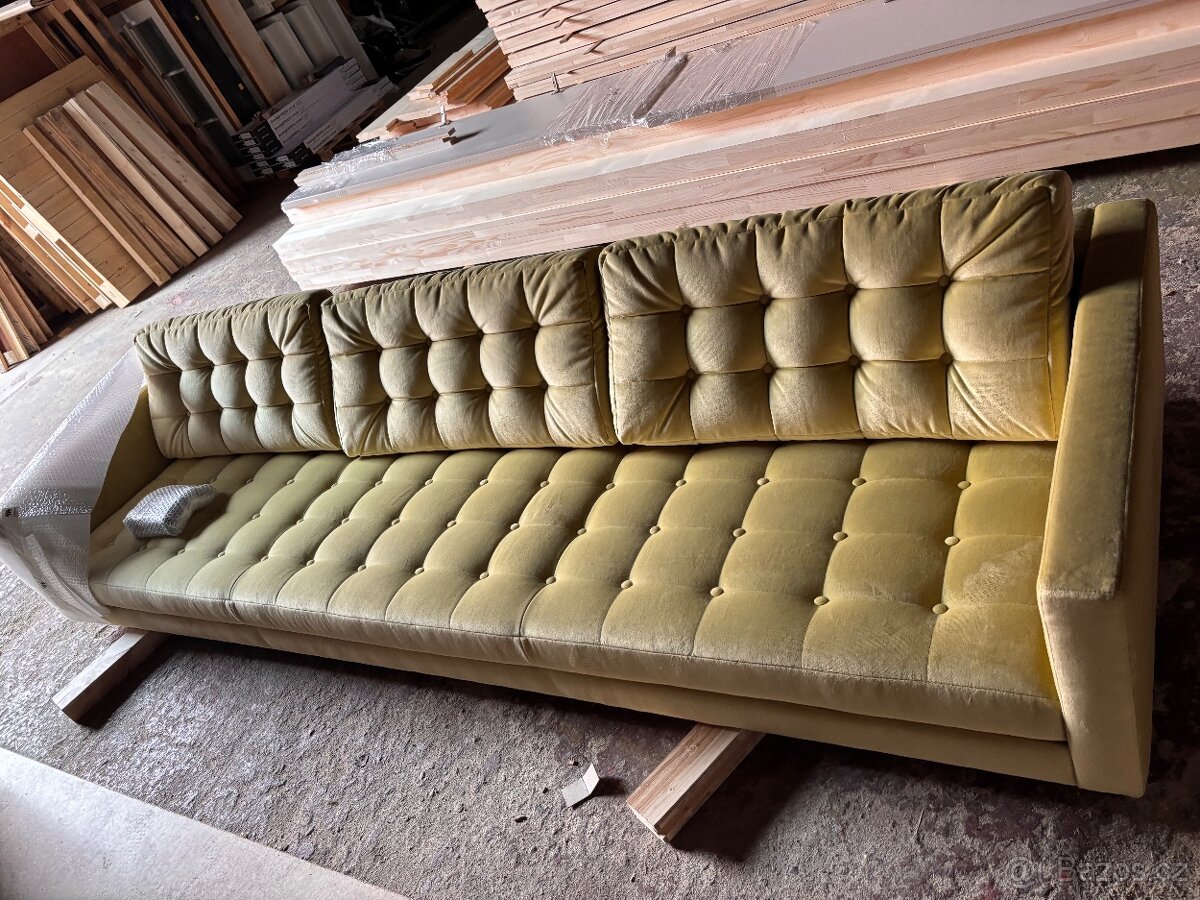 Prodám novou, zabalenou sofu. Pravý kvalitní zelenkavý semiš. Rozměry d:285, š:90cm. Nemáme pro ní nakonec využití.