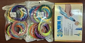 Nové 3D pero v krabici s příslušenstvím K tomu filamenty různé barvy, dvě sady. V sadě 20ks barev po pěti metrech. Specifikace: Barva: modrá Motor: kovový Tisková tryska: keramická Rychlé zahřátí: v cca. 40 sekund až 160 °C Režim spánku: po přibližně 3 minutách nečinnosti Displej: LCD (indikuje teplotu a provozní režim) Nastavení teploty ohřevu: srozsahem 160-210 °C Nastavení rychlosti tisku: plynulá změna Kompatibilita filamentů: PLA a ABS Průměr filamentu: 1,75 mm Průměr tiskové trysky: 0,7 mm Napájení: 5 V / 2 A Certifikace: CE, FC, RoHS