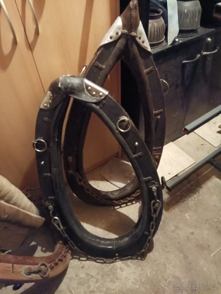 Nabízím chomout 74x35 72x33 V případě zájmu ještě přeměřim.Cena i s pohuškou,možno i kompletní pracovní velmi bytelný postroj 8500 i s chomoutem,k jednomu poduška navíc