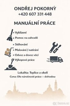 Cena: Dohodou. 🛠️ Odvezu-přivezu/Manuální práce – Teplice a okolí 🛠️ Nabízím: • Vyklízení • Výkopové práce • Pomoc na zahradě • Stěhování • Malování / natírání • Odvoz a dovoz věcí 📍 Lokalita: Teplice a okolí 💬 Cena: Dle náročnosti práce – domluvou 📞 Kontakt: +420 607 331 448 – rychle, efektivně a s osobním přístupem Neváhejte se ozvat a domluvíme se podle vašich potřeb!