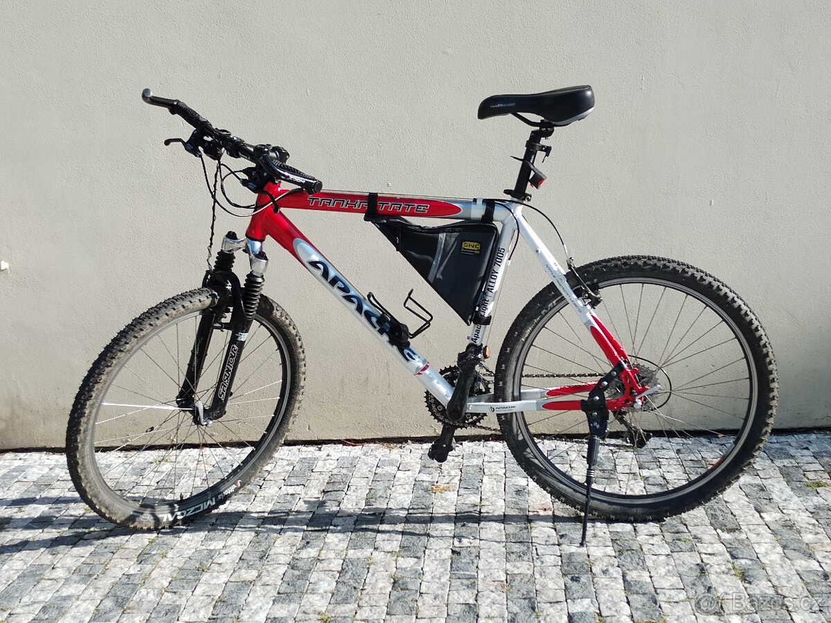 -rám Apache AlloyLight 7005 22" (ideál pro postavu +-170-190cm) -kola 26" x 2.1" -přesmykače - vpředu tříkotoučový, vzadu osmikotoučový Kolo bylo nedávno v servisu, seřizovaly se brzdy a kola, jeden přední kotouč (ten největší, viz foto) je úplně nový + péče o řetěz. Kolo má nastavitelné tlumiče (ne přímo od řídítek). Jde o kolo perfektní pro dojíždění (např. do školy, do práce, atd.). Ačkoli je starší, je opravdu pohodlné, dojížděl jsem s ním přes půl města s klidem :) (!!!)Kolo neprodávám, protože by bylo ve špatném stavu, ale protože jej již nepoužívám. Součástí je i brašna do rámu, držák na pití, držák na pupmičku (viz foto) a zadní světlo (bez baterie). Za vlastní odvoz sleva 5% (200Kč).