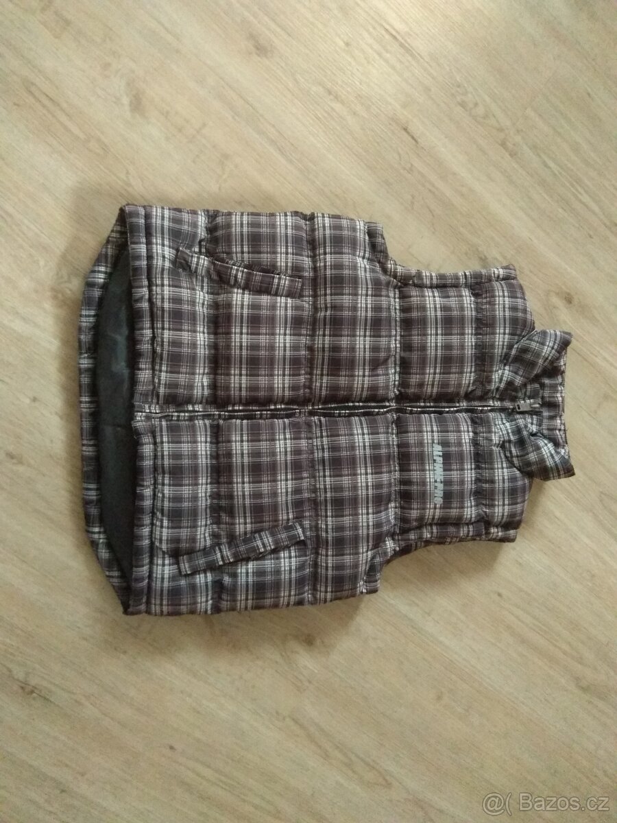 Teplá vesta, zn. Alpine Pro, velikost 122/128, jako nová, hodně vatovaná. Délka od ramene 50 cm plus 6 cm prodloužení na zádech.
