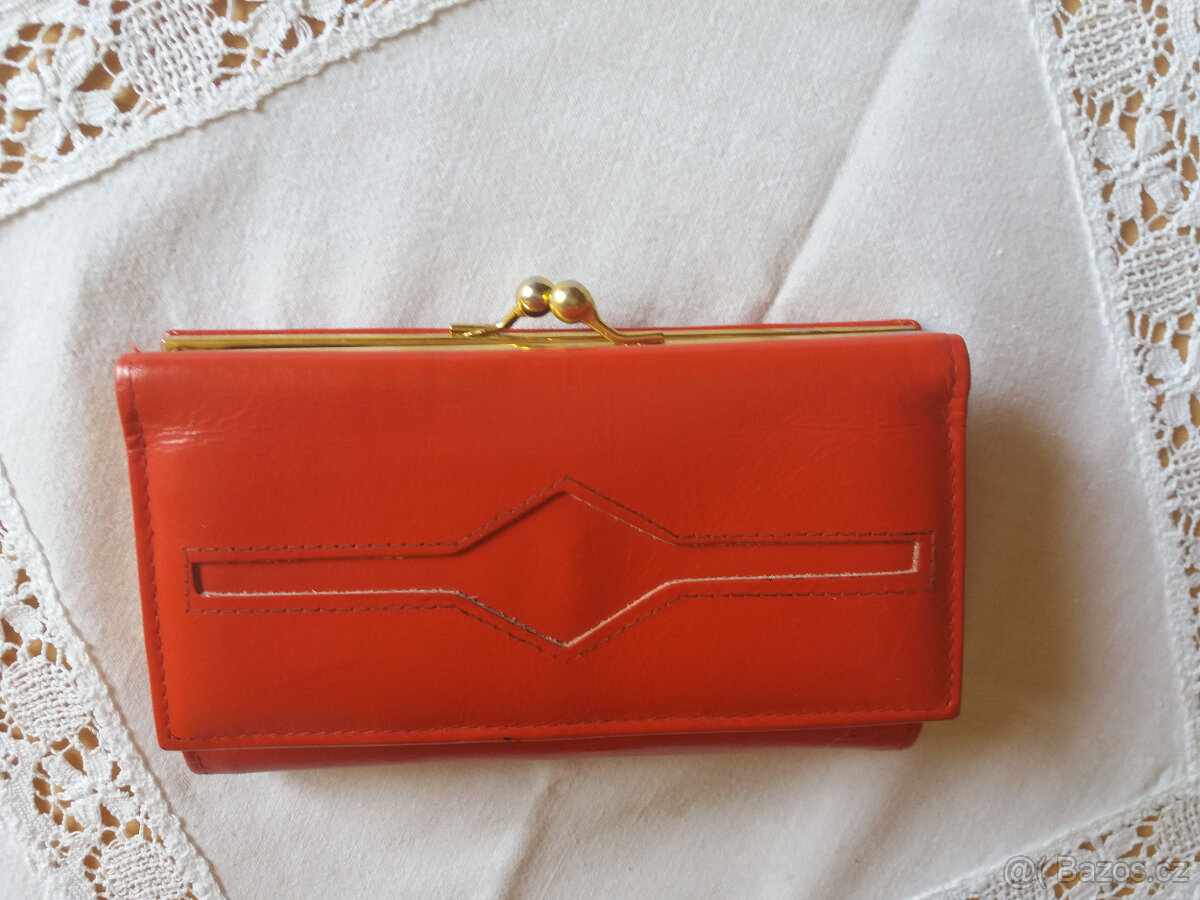 Jasně červená, zlatý rámeček. Nová, nepoužívaná. Rozměry: 13,5 x 8 cm. Dělená kapsa na drobné, Vnitřní kapsy na karty a papírové bankovky.