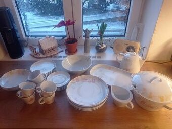 Krásné stolní nádobí. Velké talíře 6ks, hluboké 3ks, dezertní 6 ks, podšálky 5ks, hrnky 6 ks, oválný talíř, mísa, omackovnik, mísa na polévku, konvice na čaj. Pouze osobní odběr