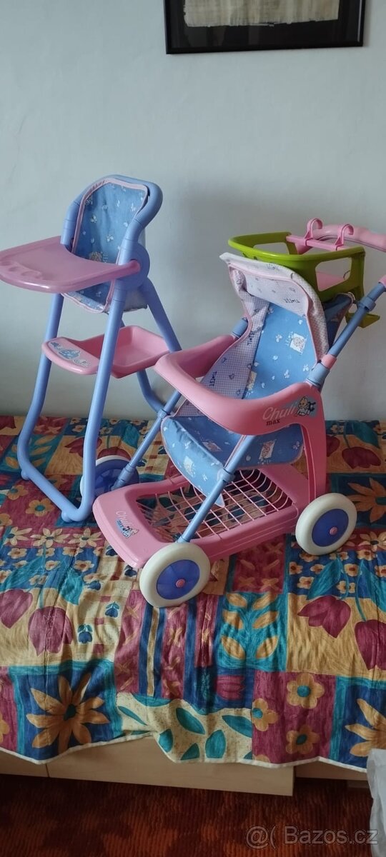 Prodám plastový kočárek pro panenky výška 58cm.+krmící židle značka Chuli Max pěkný stav.