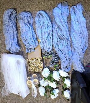 Nabízím k prodeji část své svatební výbavy, která obsahuje: - 1 ks závoj (180 cm) - 9 ks přilepovací květ na auto - 14 ks dřevěný svícen na čajovou svíčku - 2 ks dekorační látky na stůl (280 cm x 40 cm) - 3 ks dekorační látky na stůl (180 cm x 40 cm) - 3 ks umělý trs zamrzlých borůvek - 1 ks krabička se sušenými bílými kvítky Vše prodávám DOHROMADY, nelze koupit cokoliv zvlášť. Osobní převzetí ve Frýdku-Místku.