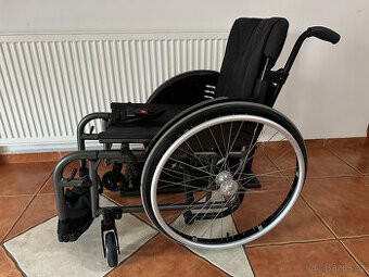 Mechanický odlehčený invalidní vozík ve výborném stavu, má skládací rám (skládá se jen zatažením za sedák), má rychloupínací kola, parkovací brzdy, odklopné a odnímatelné podnože, vzadu velkou kapsu, je vybaven také bezpečnostním pásem a má blatníky. Šířka sedu je přibližně 41 - 43 cm. Celková šířka vozíku je cca 60 cm.