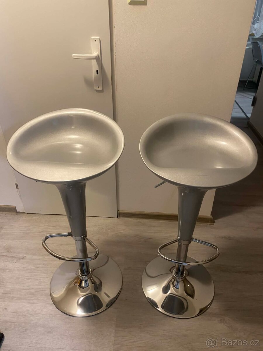 Prodám použité, ale velmi zachovalé barové židle. Nastavitelná výška, otočné, kovová noha s opěradlem. Cena za obě.