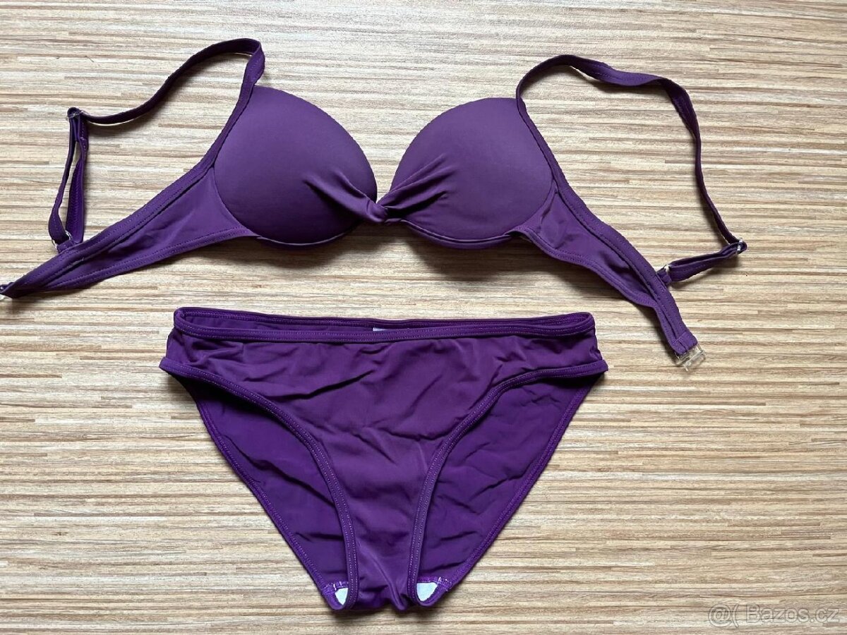 Fialové dvoudílné plavky. Podprsenka s kosticemi, mírně podšitá, klasické zapínání - vel. 75B. Kalhotky vyššího střihu - velikost uvedena 36/38, odpovídají spíše té velikosti 38. Málo nošené. Cena 90 Kč. Osobní předání Sušice (okr. Klatovy) nebo poslat