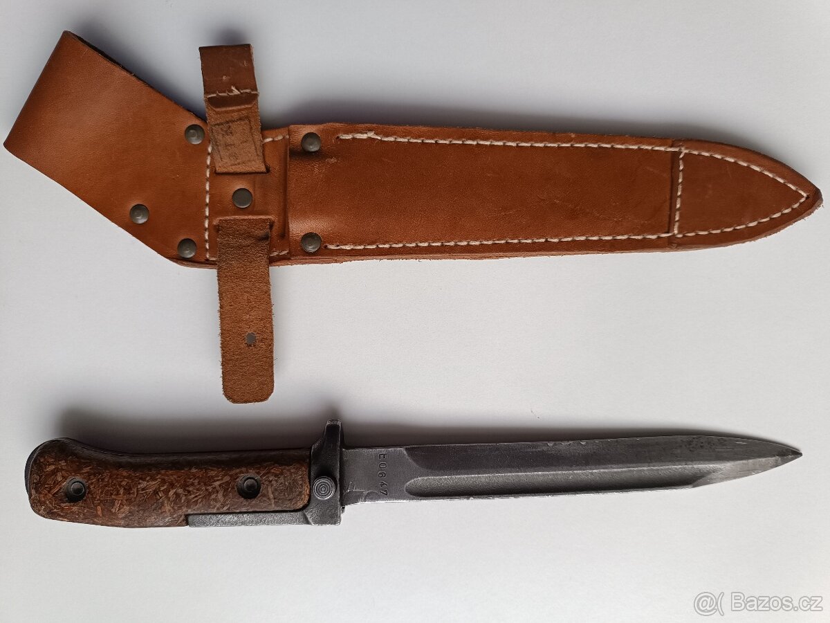 Prodám použitý bodák vz.58. S prodlouženým řapem a koženou pochvou. Na "ostří" pár mírných záseků viz-foto. Předání pouze osobně. Pouze volat.
