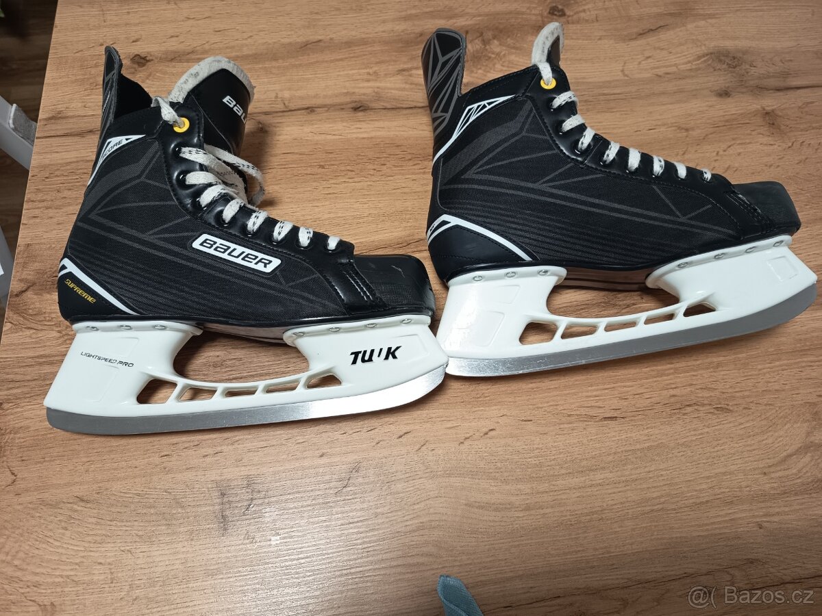 Bauer supreme 44,5. Jsou pěkné jen pár oděrek asi tak 8x na noze. Prodávám z důvodu špatné velikosti.