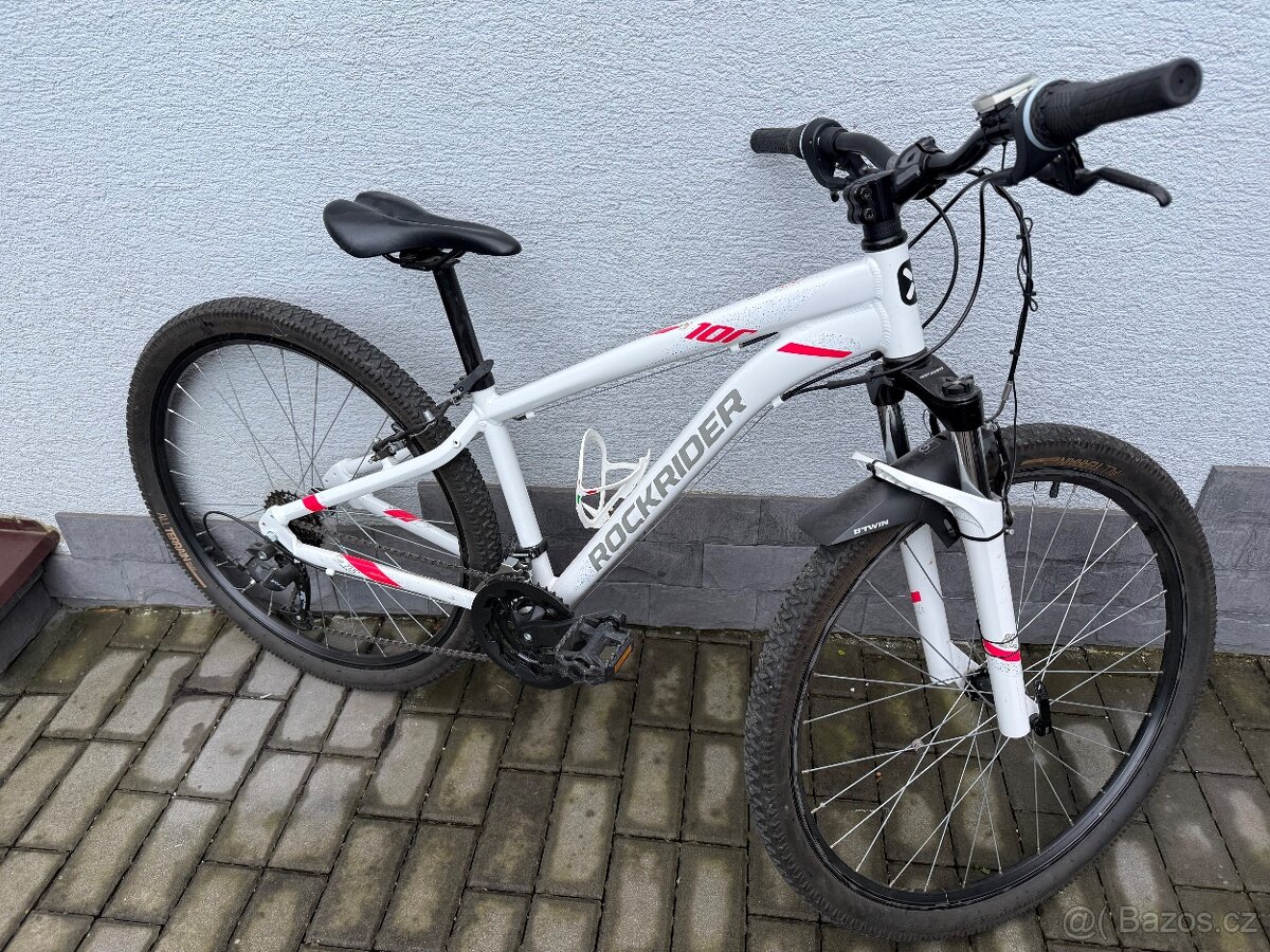 Prodám dívči kolo Rockrider ST100. Rám: Lehký hliníkový rám (slitina 6061). Odpružení: Přední odpružená vidlice se zdvihem 80 mm a možností nastavení tuhosti podle hmotnosti jezdce. Převody: Systém 3x7 (celkem 21 rychlostí) s otočným řazením na rukojetích (např. Shimano Grip-Shift). Kola a brzdy: Kolo je osazeno brzdami typu V-brake. Velikost kol 27,5.