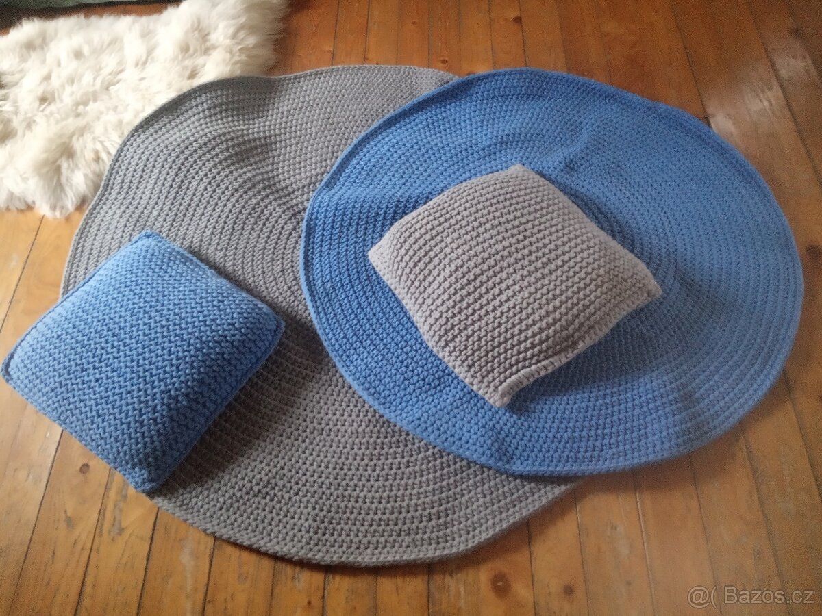 2 kulaté koberce + 2 polštáře. Pletené/háčkované - ruční práce. Zachovalé, používané v dětském pokoji. Koberce jsou vyprané, polštáře je nutné vyprat. Šedý, větší, průměr 130 cm, modrý, menší, průměr 108 cm. Preferuji prodej dohromady. Vysoká pořizovací cena. Pouze osobní odběr, nebo zašlu, ale poštovné bude dost vysoké.