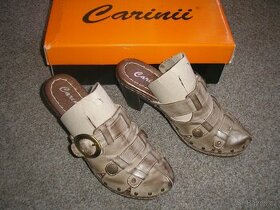 Prodám kožené pantofle na podpatku 8 cm, zn.Carinii, vel.37 (stélka cca 22,5 cm).Málo nošené,jako nové. Na předních páskách chybí ozdobné cvoky-viz foto, ale ničemu nevadí-pásky drží. PC 1648,- Nyní cena 690,- a pošta.