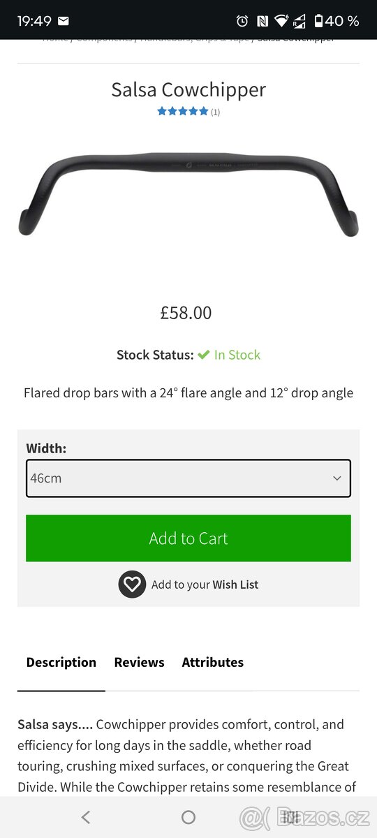 Prodám pohodlné gravel řidítka Běžná cena 1700kč, prodám za 600kč Šířka: 46cm drop: 116mm bar reach: 68mm Flare Out / Outsweep: 12° Drop Flare: 24° weight: 322g Osobně Brno nebo zásilkovna