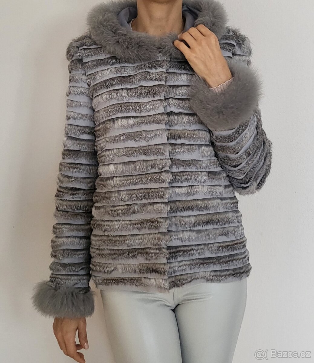 Prodám kožich KARA králík a textil, vel XS v perfektním stavu. Šedá barva, p.cena 10000,.