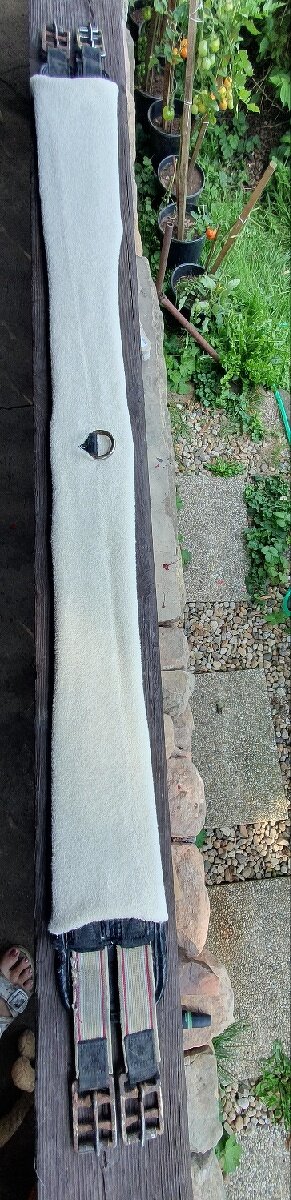 Prodám anatomický podbřišník opatřený elastickými gumami z jedné strany, D kroužek uprostřed vhodný k lonžování nebo připnutí pomocných otěží, délka 130cm. Starší, používaný, ale pořád funkční. Prodám včetně potahů.