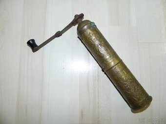 Prodám starý mosazný mlýnek.Výška:21,5cm,šířka:4,4cm.