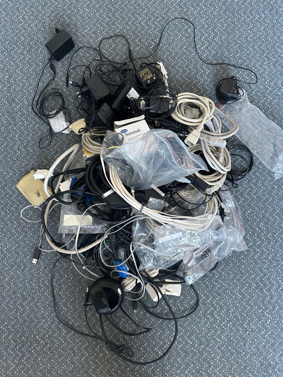 Směs různých typů kabelů a propojovací techniky. Napájecí a monitorové kabely k stolním PC HP, datové kabely, VGA kabely, napájející adaptéry, datové kabely, USB-A, Micro-USB, stolní napájení pro myš, čtečka karet, telefonní kabely, propojovací kabely a řada dalších. Odběr pouze jako celek, nikoliv po kusech. Celková hmotnost asi 4kg. Osobní odběr v Ostravě, po-pá 9-18h. Nikam nevozím, nic nefotím. Případně lze po platbě na účet zaslat zásilkovou dle jejich ceníku. Kontakt pouze mailem.