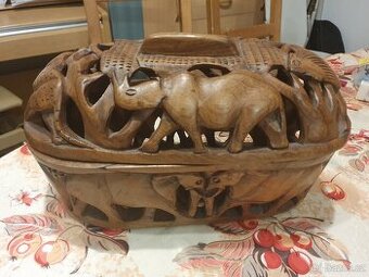 Vintage ručně vyřezávaná dřevěná úložná dóza /chlebník/miska na ovoce, víceúčelový předmět, krásný sám o sobě, v africkém zvířecím stylu s vyřezávanými nosorožci, gepardy, buvoly, slony a lvy, v krásném stavu, fotografie jsou součástí popisu a stavu, krásný a výrazný kus, unikátní předmět, rozměry cca 30 cm na délku x 17 cm do hloubky x 20 cm na výšku. Ruční práce, dovoz z Jižní Afriky.