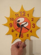 Prodám hodiny Sluníčko - dřevěná dekorace na zeď do dětského pokoje. Ručně malované, použity ekologické barvy. Jako nové. Pořizovací cena 550Kč.