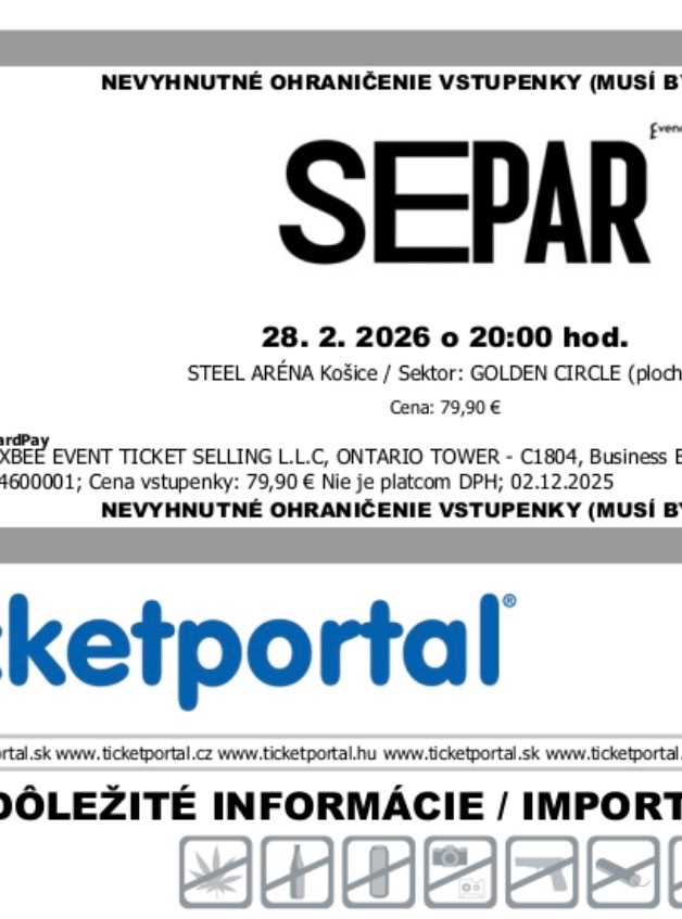Prodám vstupenky na Separa 28.2.2026 Golden circle. Možnost prodat dokupy i samostatně a Nyní přenechám se slevou. Objednával jsem je minulý rok, ale nemohu tam jet ze zdravotních důvodů