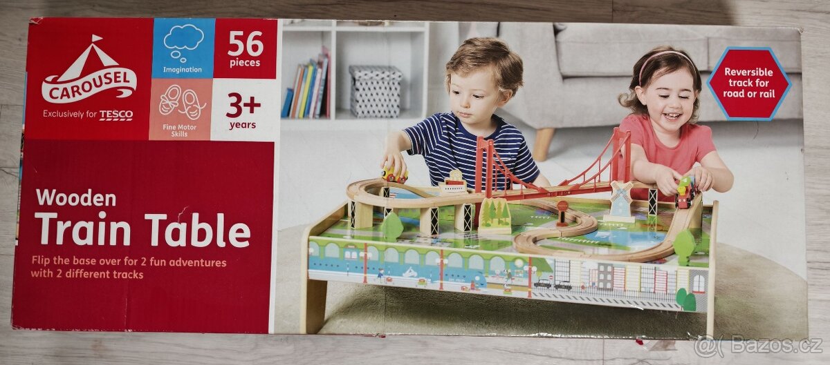 Prodám vláčkodráhu Carousel 56 dílů s hracím stolem. Stav jako nová.