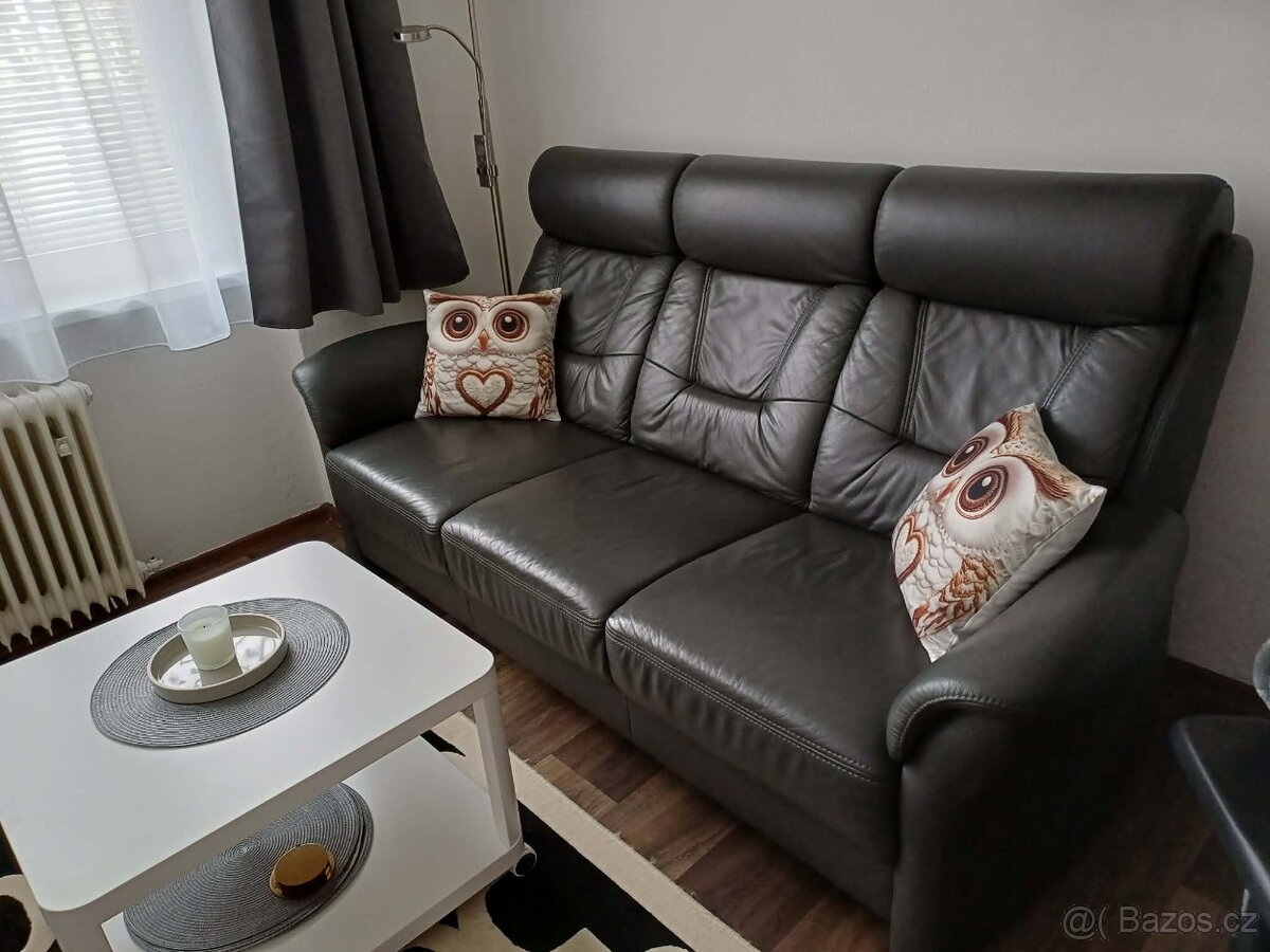 Prodám koženou sedačku, černá kůže. Jako nová, krásná. Bez vad. Trojsedák, pohodlná na sezení. PC - 35 000,- Při rychlém jednání sleva Nutný vlastní odvoz.