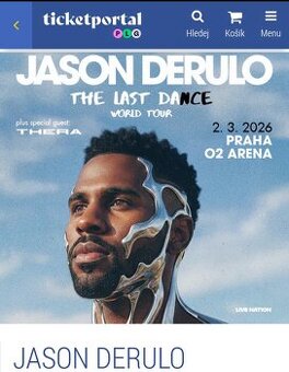 Prodám 1 vstupenku na koncert JASONA DERULA do Prahy O2 Areny 02.03.2026 od 20:00 hod.Sekor: Stání Vstup SEVER Původní cena 1690 Kč .Nyní prodám za 1200 Kč .Předání po domluvě ,nebo den konání koncertu