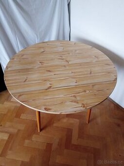 vhodný do malé panelákové kuchyně. Rozložený průměr 110 cm, složený rozměr 64 x 110 cm. Nohy se dají pro přepravu odšroubovat. Povrch plastová folie. K vyzvednutí v Ostravě. Zájemci volejte tel. 603 972 469 od 9 do 18 hod.