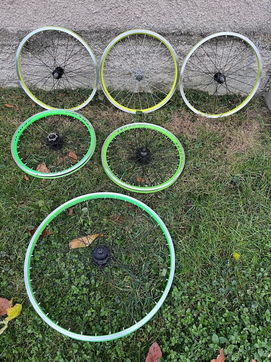 Prodám nové výplety kol o velikosti 1ks- 26" 20" -5ks Náboje z toho dva na kotouč. Brzdu. -vhodné většinou na koloběžky.
