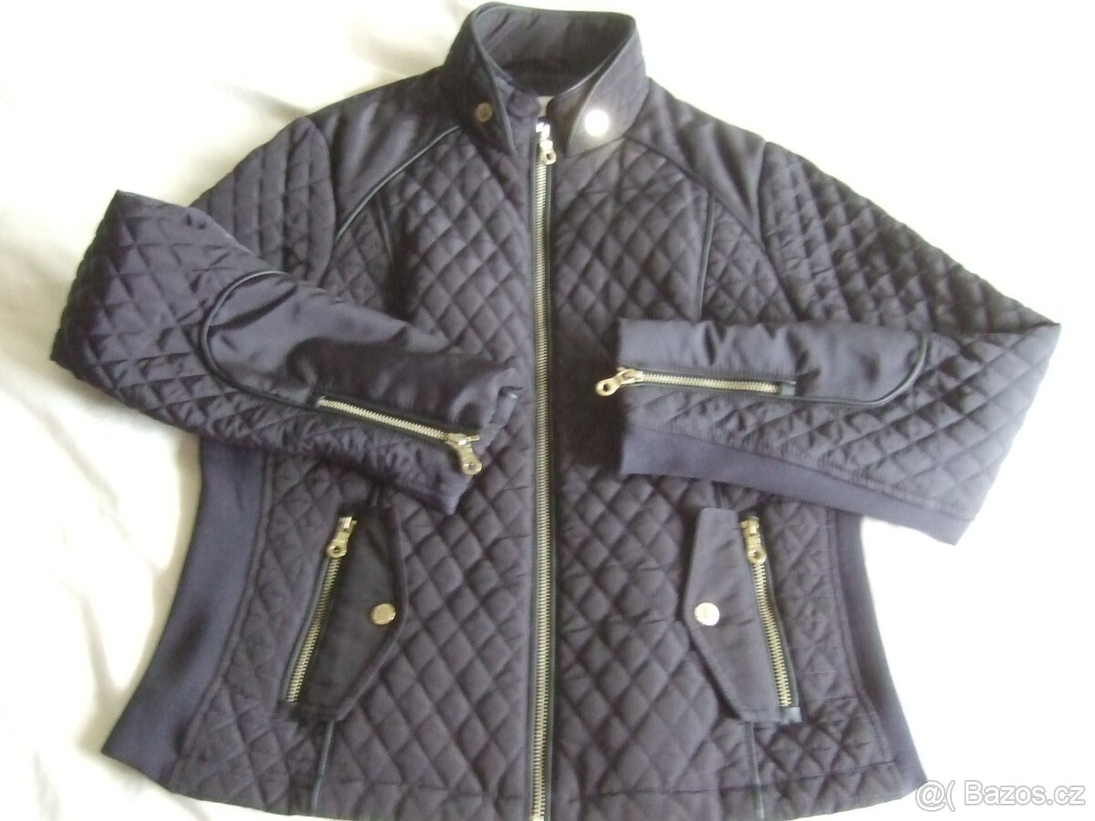 Bunda prošívaná přechodová. Značka Per Una. Vel.42. Šířka 52 cm a délka 57 cm. Barva tmavě modrá. Vhodná na podzim a jaro. Zlaté doplňky. Stav jako nová.