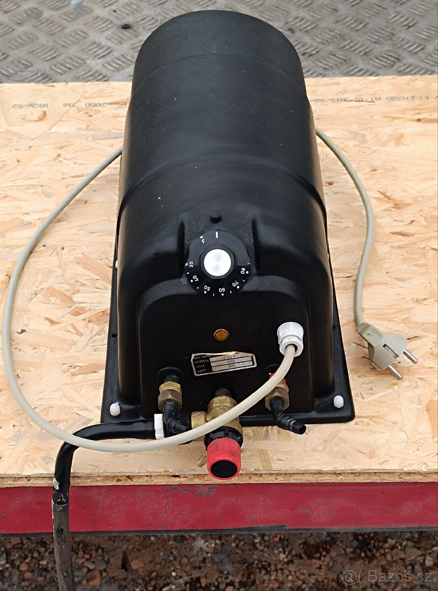 Prodám bojler do karavanu, obytného vozu. Bojler je na 5 litrů, funkční. Model 48167,220 V, 800W. Regulace teploty v rozsahu 30°C- 80°C, kontrola signalizující ohřev vody, pojistný ventil (slouží k vypuštění přebytečného tlaku). Bojler se při poklesu teploty dokáže sám vypustit. Je to z toho důvodu, aby nedošlo k zamrznutí obsahu (vody) a poškození pláště.