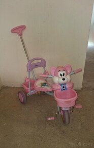 Tříkolka má běžné známky opotřebení, oči po zmáčknutí tlačítka na hlavě mrkají, další tři tlačítka dělají zvuky a melodii, vodící tyč.