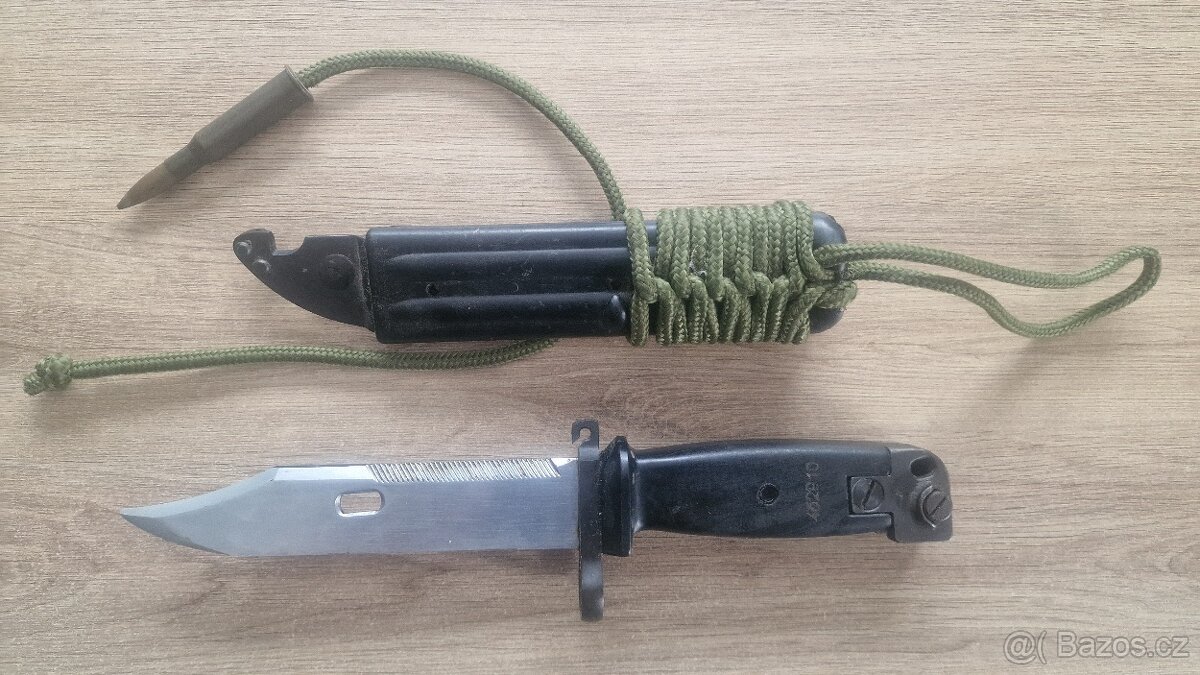 Prodám jugoslávský bajonet na AKM/M70 v pěkném stavu. Na pouzdře je závěs z paracordu. Bajonet je sčíslovaný. Cena - 1000kč Můžu poslat přes Českou poštu na dobírku (180kč).