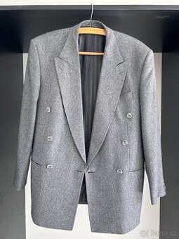 Pánský oblek - vlněný šedá barva sako + kalhoty velikost 46 rozměry viz. foto sako - šířka 54cm, podšívka, 2 vnitřní kapsy, ramenní vycpávky kalhoty - pas 80cm osobní převzetí je možné v Turnově nebo doprava DPD / Zásilkovna