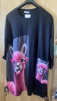 kombinace pružné bavlny a jakoby hedvábné látky s potiskem růžové lamy. Vpředu jedna velká pasa, dole po obou stranách na zdrhnutí. Průramky 148 cm, délka 103 cm.