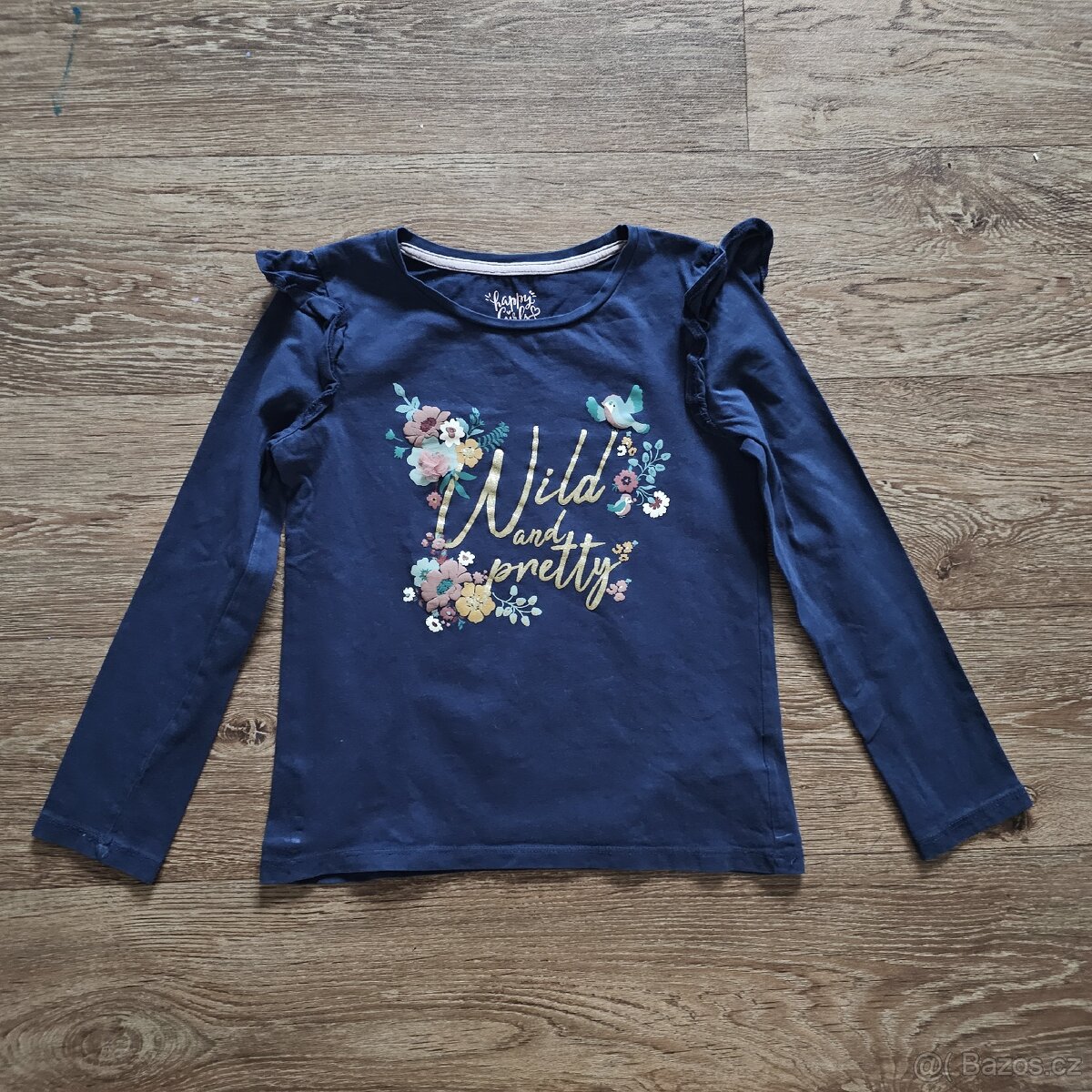 Krásné tmavě modré triko, nápis trpytivý. Krásný stav, asi dvakrát oblečené. Délka:: 45,5 cm, délka rukávu od krku: 50,5 cm. Materiál: 100% bavlna