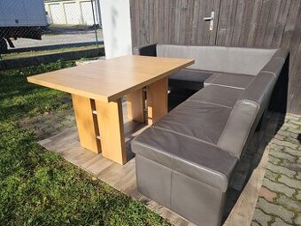 Souprava je v hezkém stavu, minimální známky opotřebení. Lavice i stůl jsou velmi těžké a snoubí se jejich kvalitou. Stůl je rozkládací a vhodný pro vaše rodinné sešlosti. Rozměry: Lavice: 181x204 cm, výška 80cm a výška sedu 47 cm Stůl: 130x90 cm a výška 75cm, při rozložení má nejdelší stranu 180 cm. Lavice lze rozebrat na 2 díly, u stolu se dají sundat nohy pro přepravu. Osobní odběr Jindřichův Hradec, nebo po dohodě možnost dopravy.
