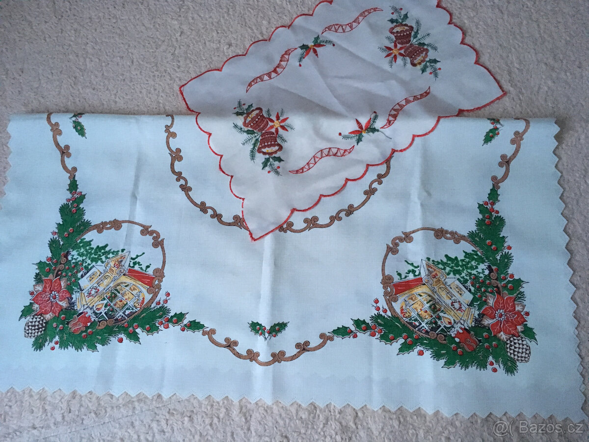 Vánoční ubrus teflonový 80x80cm, (NENÍ-dečka) 100kč - bez čísla Vánoční dečka červená vánoční hvězdy 75x45cm, oválná dečka, plátěné, obě 50kč č2 Vánoční dečka modrá lesklé, v 55x35cm, m 50x35cm, obě 60kč č3 Vánoční dečka bílá s hnědými vločkami - damašek 50x50cm, (NENÍ-hnědé květy 33x33cm) 50kč č4 Vánoční dečka bílá, zelený okraj 82x38cm, 40kč Možnost předání Prostějov, Boskovice, (po domluvě Praha). Můžu zaslat přes Zásilkovnu od 69kč nebo poštou.