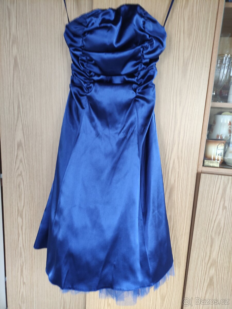 Šaty jsou z kvalitního saténu, bez ramínek, pře ramena je přehoz ze stejné látky,v prsou jsou všité vycpávky, vzadu šněrování, v sukni všitá podšívka. Délka od prsou 97 cm, šířka v prsou 41 cm, pas 35 až 36 cm. Pošlu přes balíkovnu za 75 Kč nebo zásilkovnu za 89 Kč.