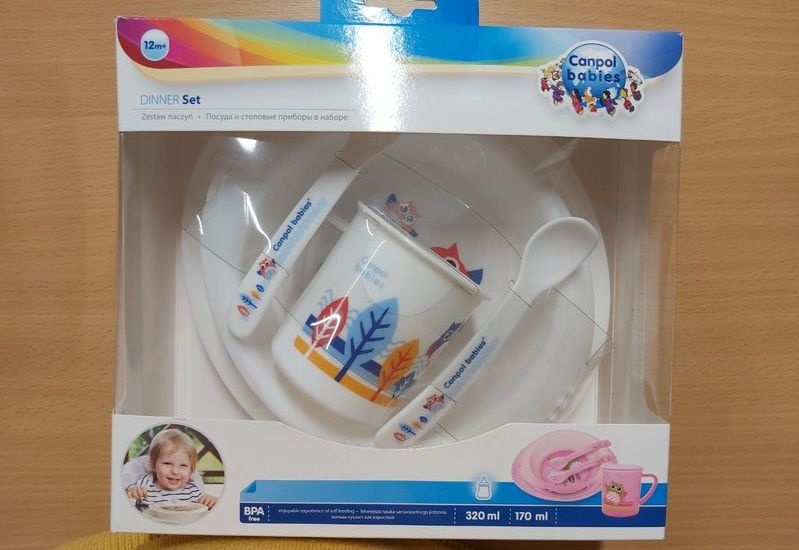 Prodám novou sadu pro děti od 1 roku. Set obsahuje mělký a hluboký talíř, hrneček, lžičku a vidličku