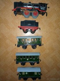 Značeno Made in U.S. Zone Germany, mašinka na klíček + tendr +2 osobní a nákladní vagon, vše velmi pěkný stav - viz foto