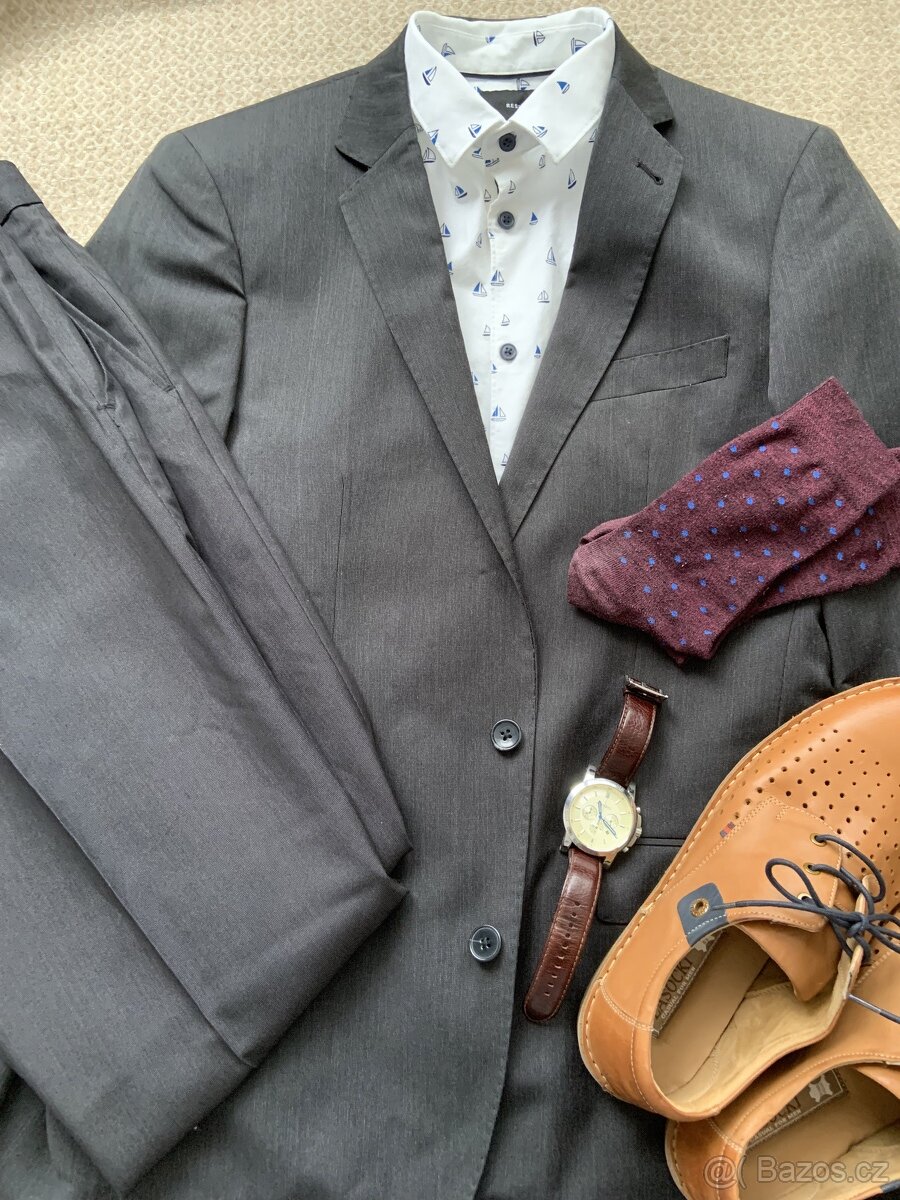 Komplet oblek tmavo sedy, F&F, parkrat nosen, sako a kalhoty