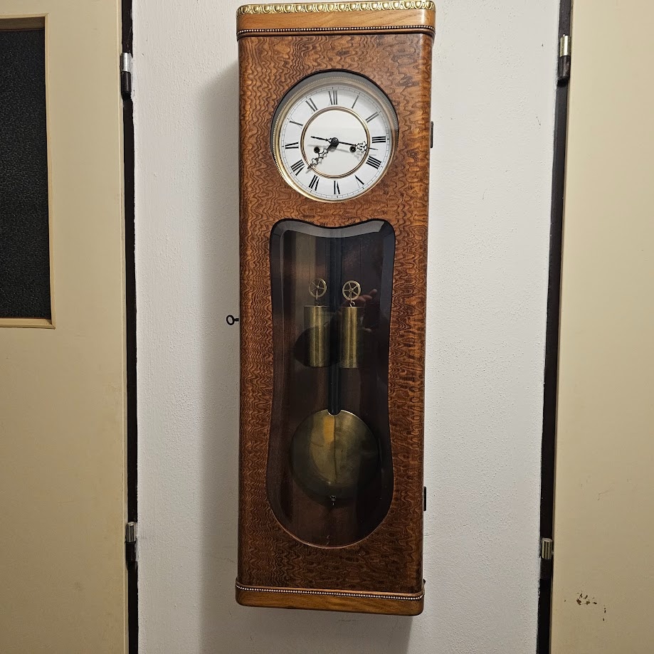 Prodám starožitné bicí hodiny ve velmi pěkném stavu, plně funkční, čerstvě po kompletním sevisu a promazání u hodináře. Kombinace dýhy ořechu a kořenice, mosazné aplikace. 86 x 28 x 13cm