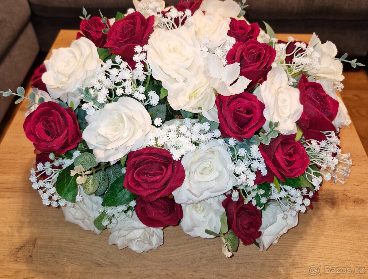 Cena: V textu. Velká oválná květinová dekorace růže,eustoma nevěstin závoj,eukalyptus 46x35x30 cm- cena 550 Kč. Menší kulatá květinová dekorace růže,nevěstin závoj,eukalyptus 26x26 cm-cena 450 Kč. Nová svatební ozdoba na zrcátka aut s přísavkou 8x bílá-cena 400 Kč 2x bordó- cena 100 Kč. Výzdoba na auto na zavázání- cena 490 Kč. Nový bílý košíček pro družičku-cena 100 Kč. Nová korsáž+náramek na ruku- cena 150 Kč. Nová dekorace ženich a nevěsta na láhev- cena 90 Kč. Nové dárkové taštičky 4 kusy s bordó stuhou- cena 120 Kč. 3 ks bílé srdce-cena 100 Kč.